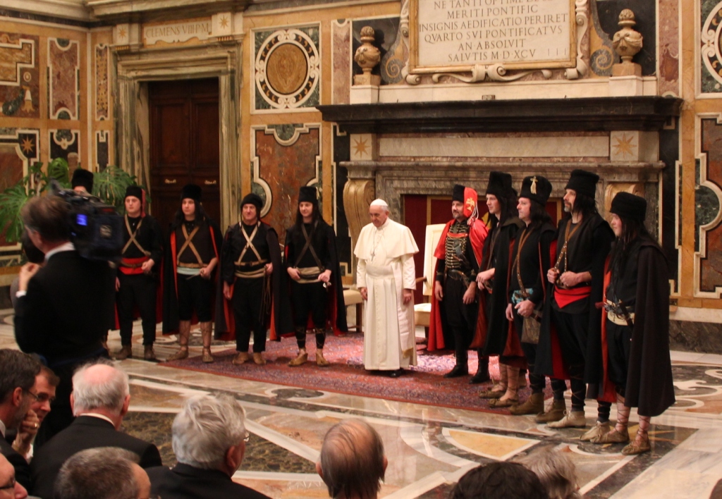 Heute galt dieser Satz nach wie vor, doch der Christbaum 2013, der Baum, der lange einen Standort zwischen Freiheit und Unfreiheit hatte, sei nun aus der geografischen Mitte und dem gefühlten Herzen Europas von den Schwarzen Panduren gemeinsam mit den Freunden aus Tschechien nach Rom gebracht worden.